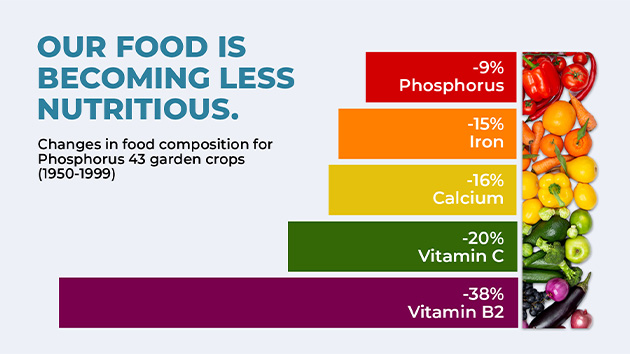 Soil depletion, food processing, and the way our food is grown and prepared have led to a decline in essential vitamins and minerals.