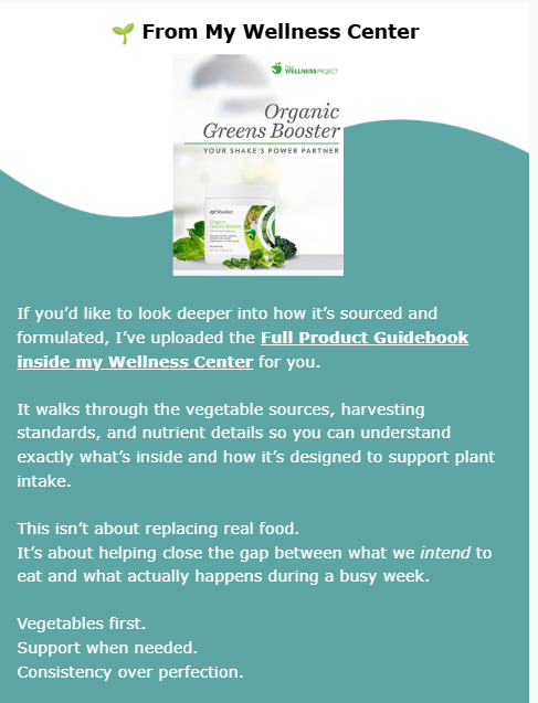 That’s where something like Organic Greens Booster can be helpful. Each scoop provides the equivalent of a cup of raw, organic green vegetables in a simple, easy format.